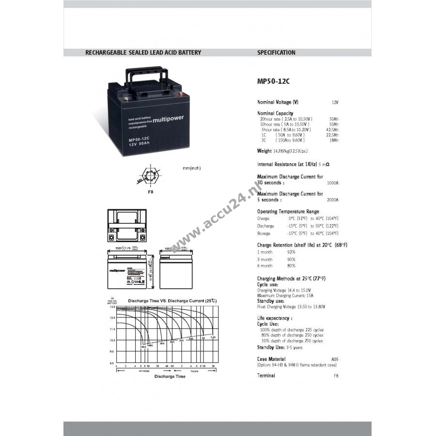 12V 50Ah/600Wh Lead-Acid Zwart 198mm x 166mm x 171mm Multipower DE 31298618